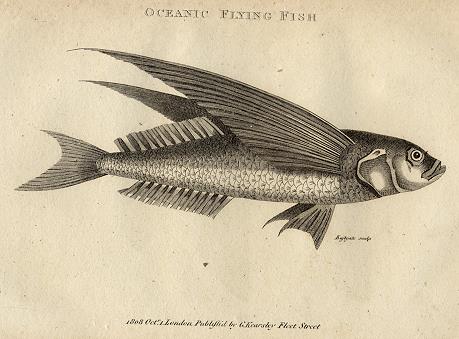 A family of marine fish (Exocoetidae family) consisting on some 64 species. The species’ defining feature is their wing-like pectoral fins used for gliding above the water’s surface for up to 50 metres. Flying fish live in all oceans, but are particularly prevalent in warm tropical and sub-tropical waters.